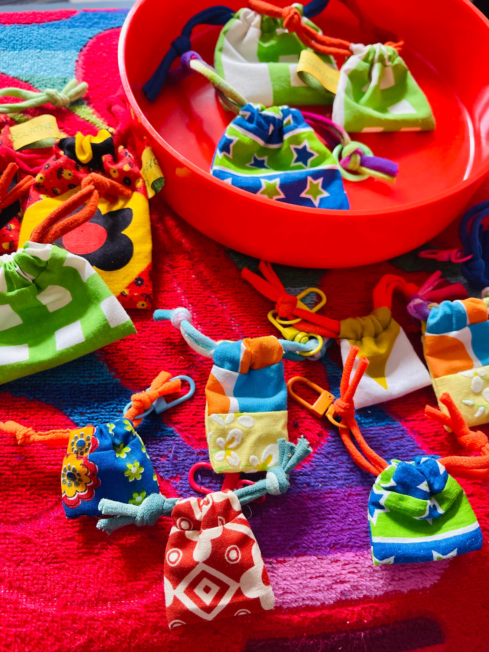 Vintage linens and fabrics and various color drawstrings are used.